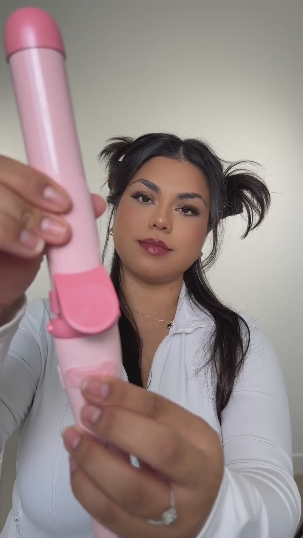 • Hold the auto-curl button and let the hair wind up the barrel